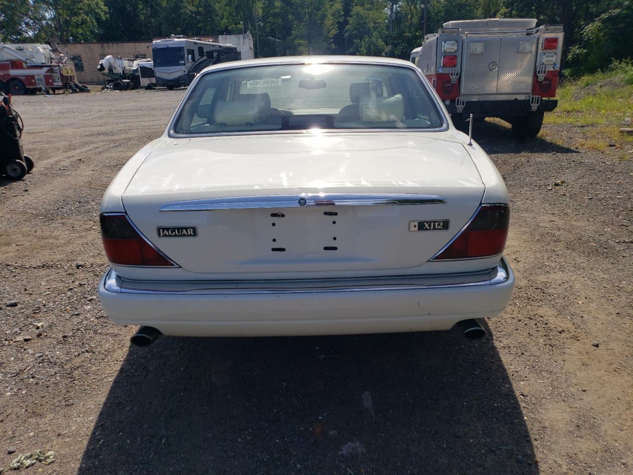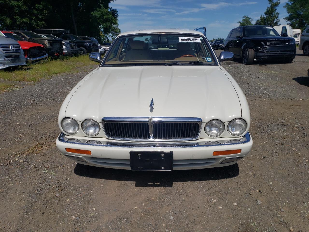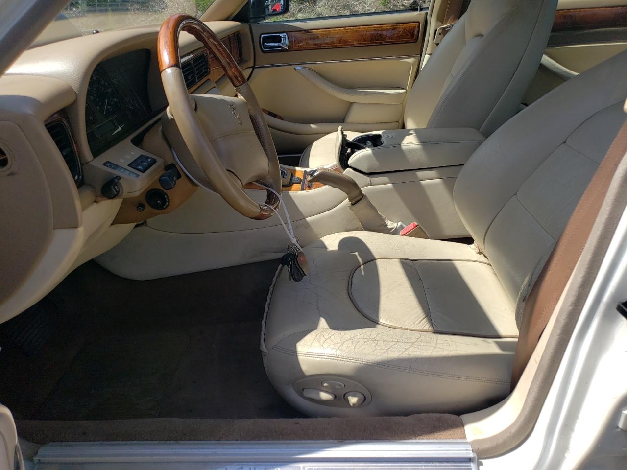 Good1995 JAGUAR XJ12, white color. Primary damage WATER/FLOOD, secondary - no damage. Run & Drive Verified. The car appears to have suffered from water damage. The exterior paint is white, with some visible wear and tear. The wheels and lights appear to be intact. The interior shows signs of wear consistent with its age and mileage. There is interior damage to the seats and dashboard, airbags are not visible in the provided pictures.