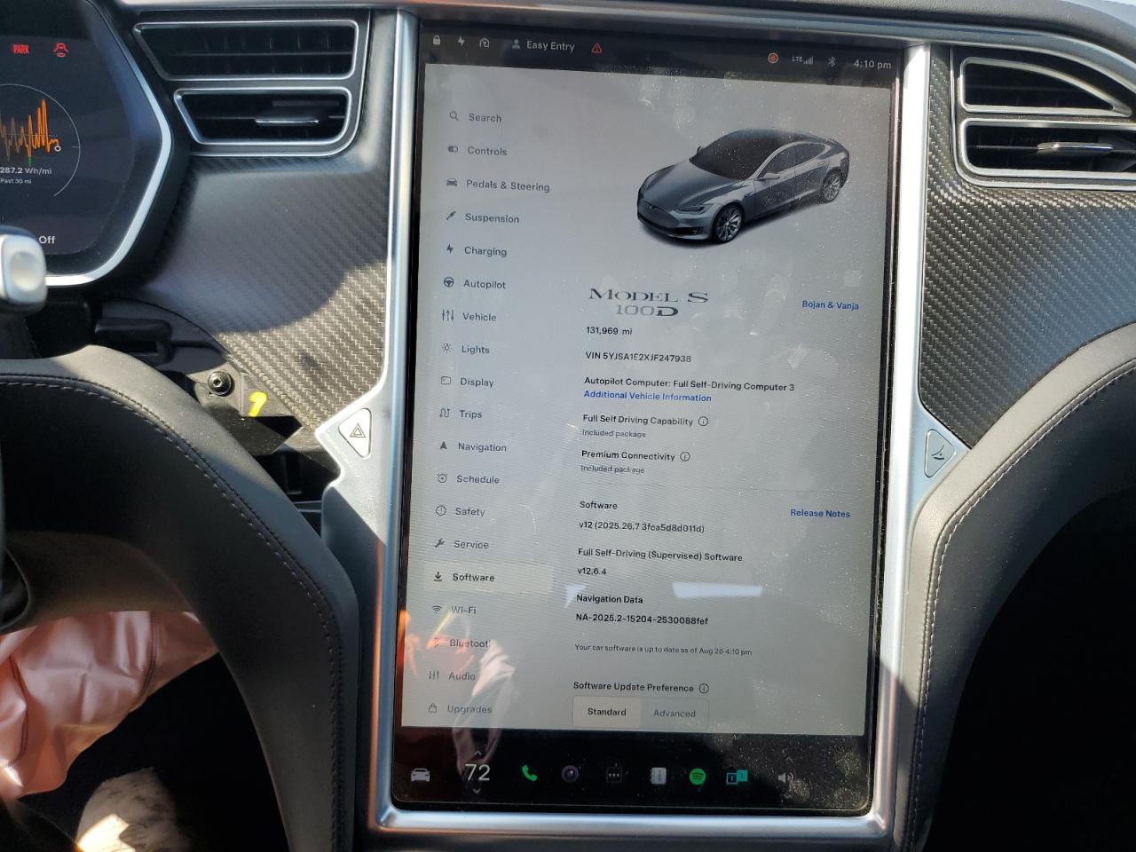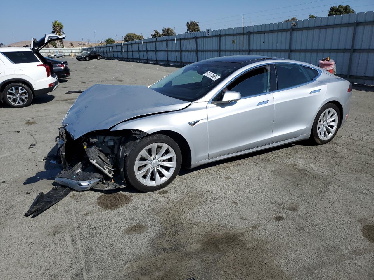FairThe silver 2018 Tesla Model S has sustained significant front-end damage, primarily impacting the body panels. The vehicle's exterior condition is rated as Fair, reflecting the moderate visible damage. The interior also shows signs of damage, earning a Fair rating as well. The overall state of the car is also considered Fair, indicating the need for repairs. It shows multiple pictures of the same car from different angles, including the interior and the exterior, and it includes an image of the car's information screen, showing the Model S details.