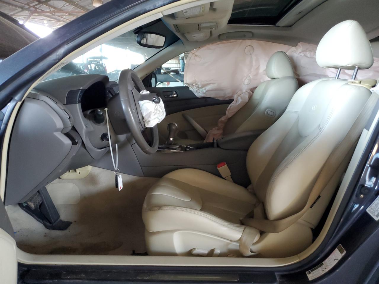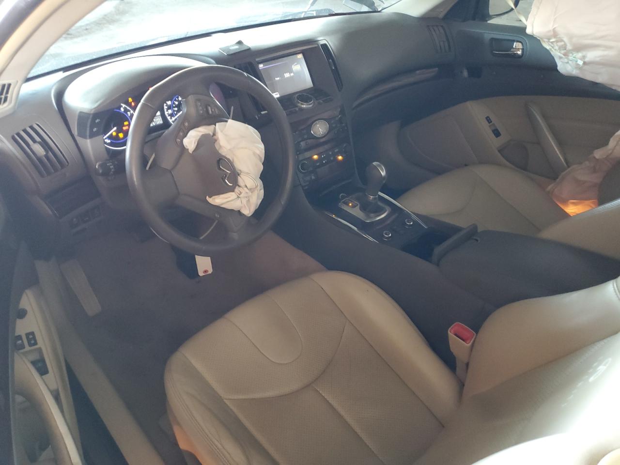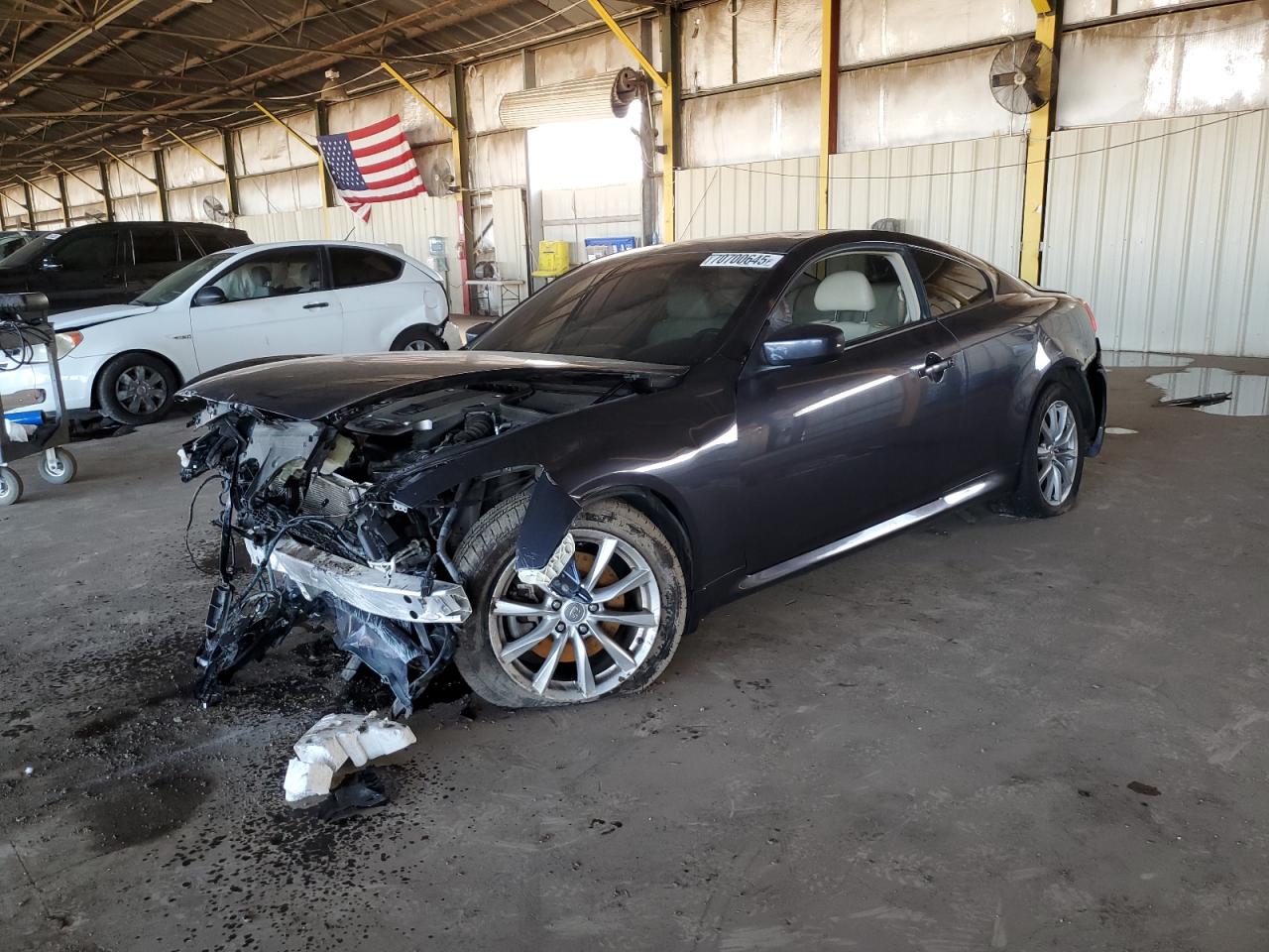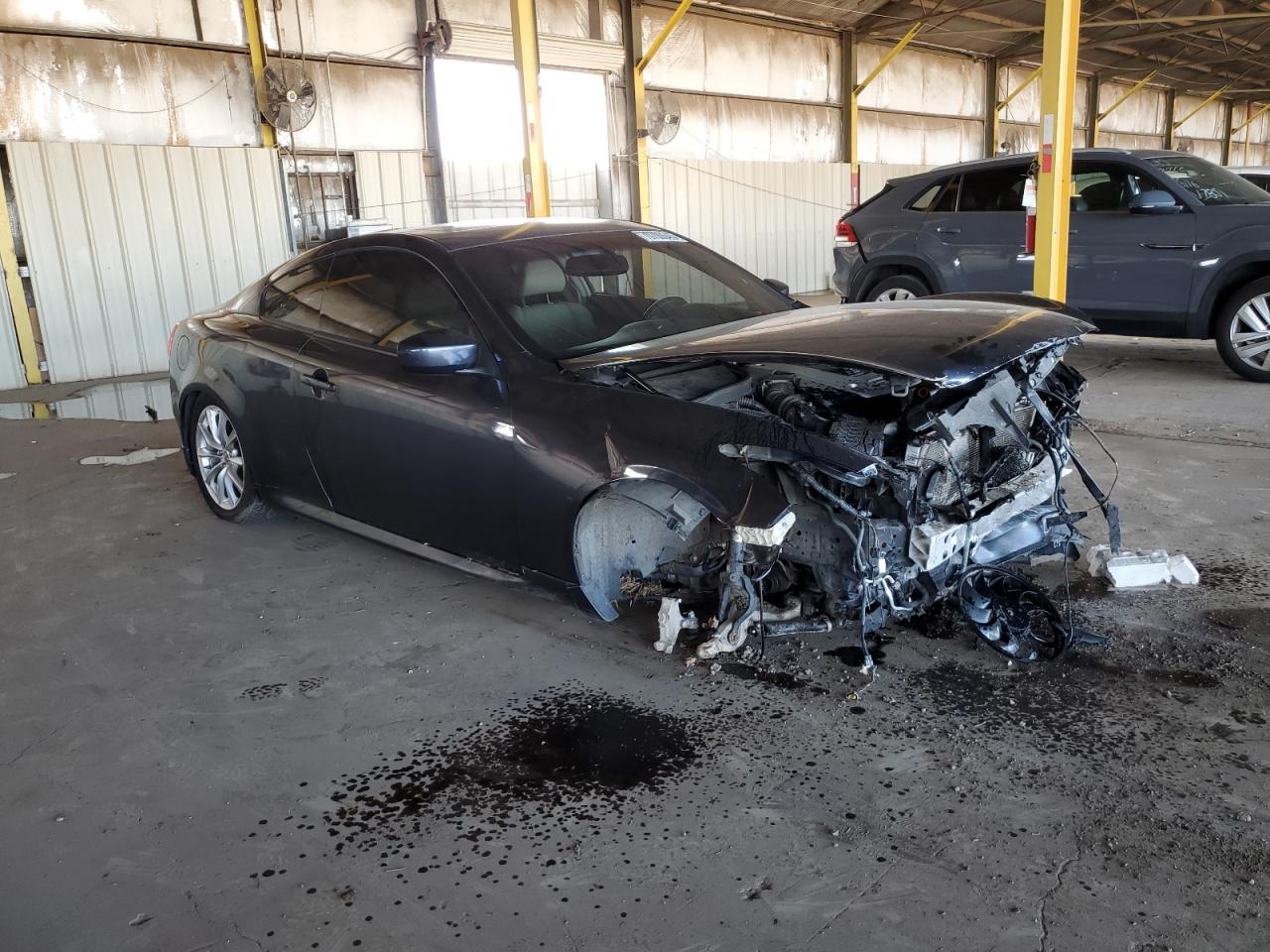 FairThe 2011 INFINITI G37, charcoal in color, exhibits significant front-end damage and some rear-end impact, indicating a collision. The vehicle's front end is severely compromised, with substantial damage to the front bumper, hood, and surrounding body panels. The airbags have deployed, signaling a significant impact. The rear end shows some damage, although less severe than the front. The interior also shows damage and the car itself is not drivable. This particular G37 has undergone significant damage. The vehicle has damage to its front end. The car needs considerable repairs and is not operational. The vehicle is being sold for parts or as a project car.