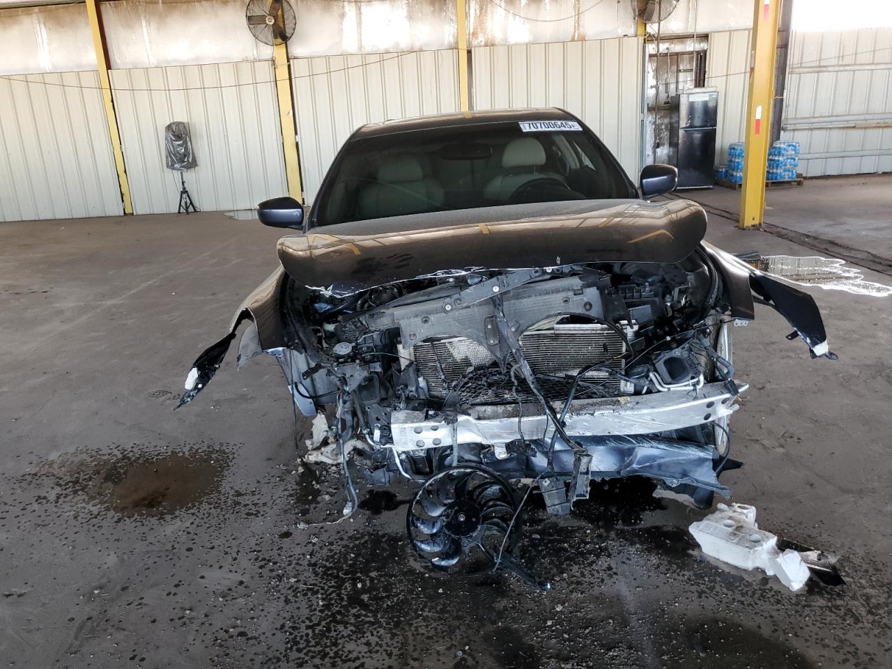 The front end has severe collision damage, with the hood, bumper, and other components heavily affected. The rear end also shows signs of impact. Airbags have deployed. The interior has damage from the crash.