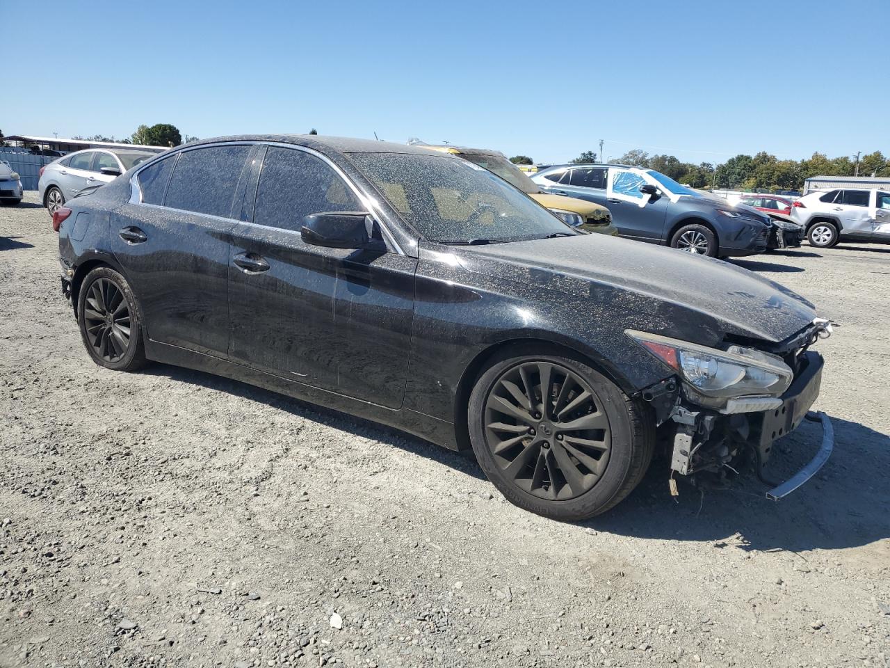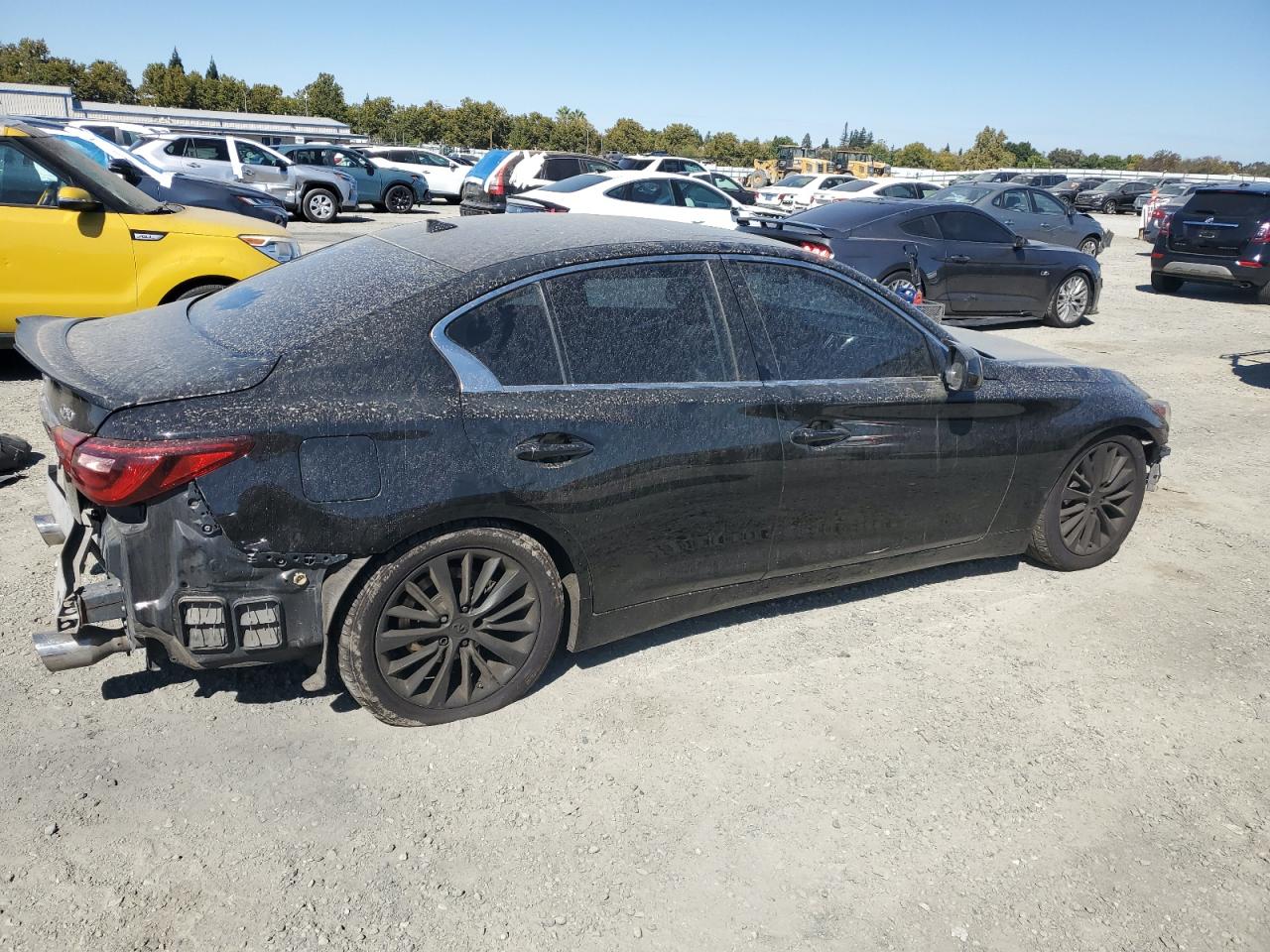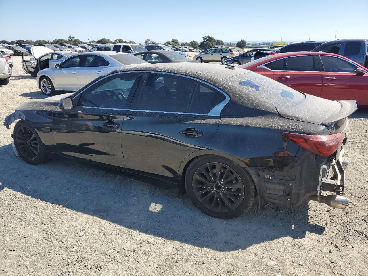 FairThis is a damaged 2018 INFINITI Q50 LUXE. The vehicle has suffered significant damage to both the front and rear ends, indicating a collision. The black exterior shows signs of wear and tear, and the body panels have sustained impact damage. The interior appears to be in better condition, with some wear consistent with the vehicle's age and mileage. Based on the images, the car has a DEFAULT start code. The damage includes: Front End Collision, Rear End Collision, Body Damage, The wheels appear to be intact, lights and glasses also have visible damage.