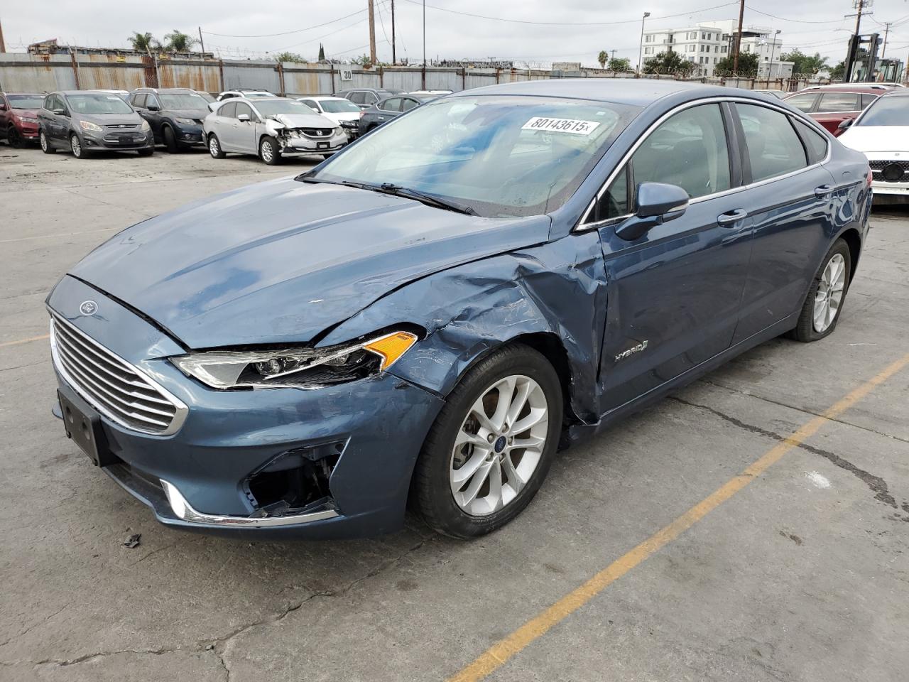 FairThe 2019 Ford Fusion SEL is presented with visible damage. The primary damage is concentrated on the front end, and secondary damage is observed at the rear end. The exterior is blue. The vehicle's operational status is listed as 'Run & Drive Verified'. The vehicle is equipped with all wheels, lights and glasses. The car is drivable. The interior shows signs of wear. Airbags status is not clear based on images, but will be inspected.