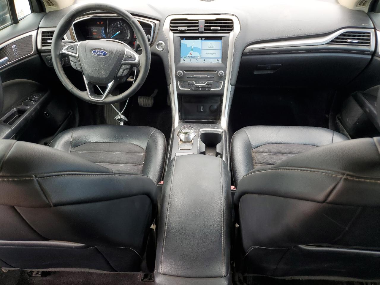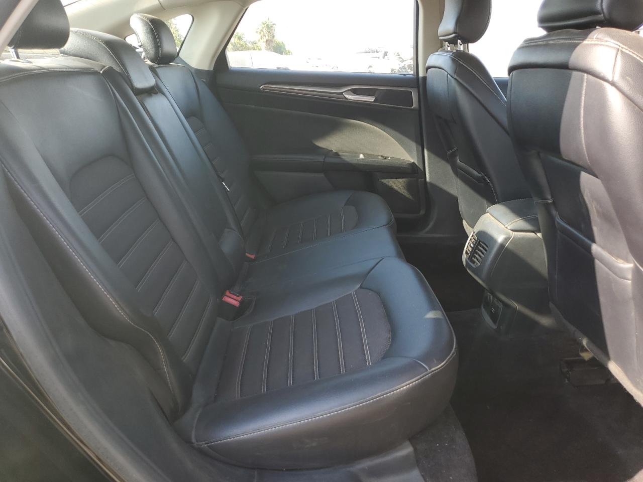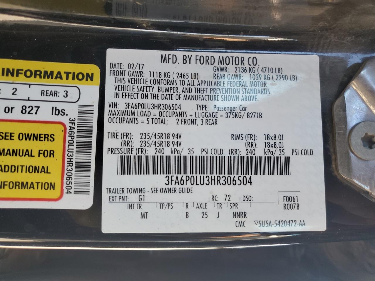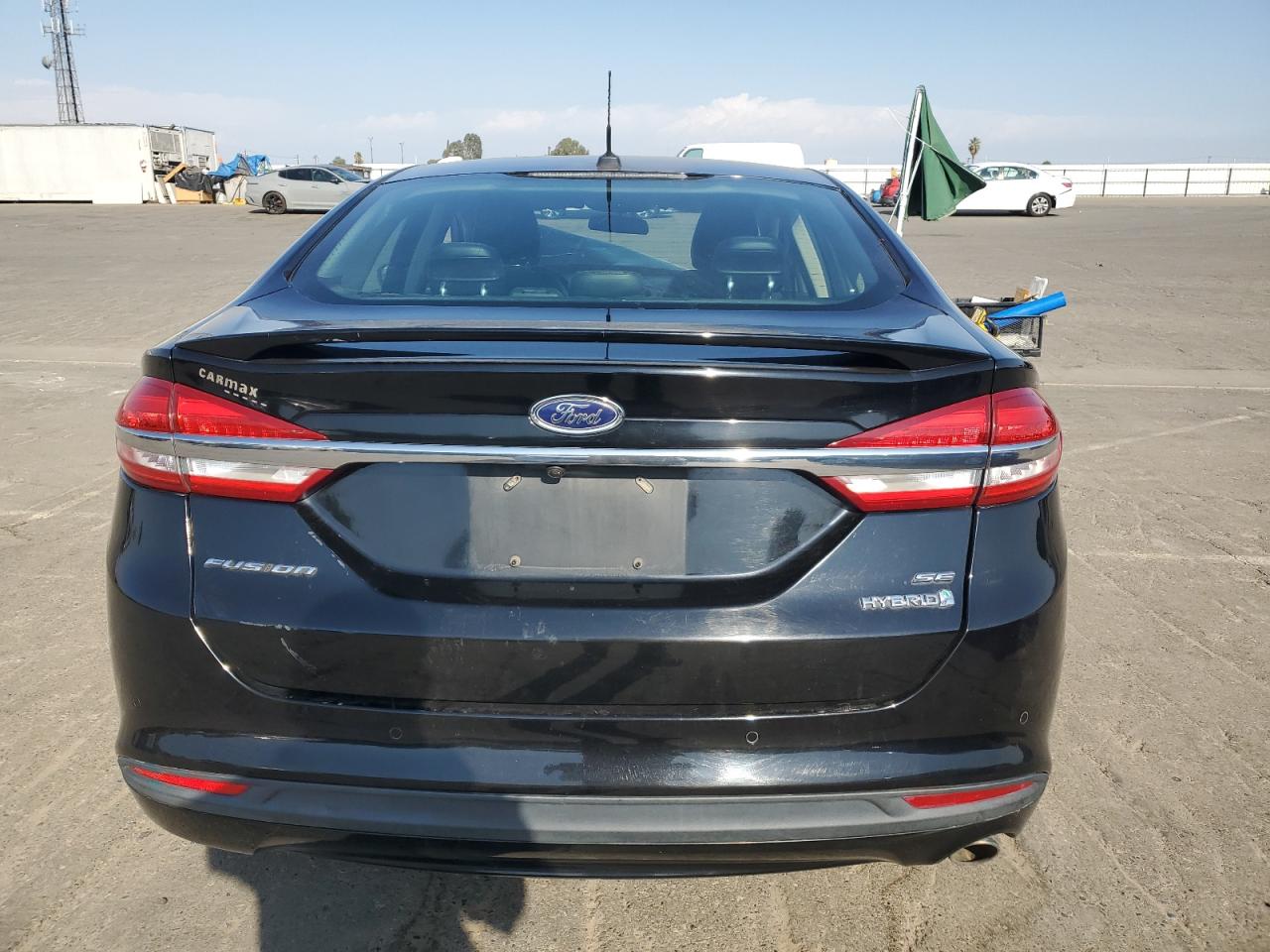 FairThe 2017 Ford Fusion SE Hybrid in black has sustained significant front-end damage. The exterior shows heavy damage to the front, including the hood, bumper, and front panels. The interior appears to be in good condition, with some wear and tear. The car is not drivable. The wheels seem to be intact and the glasses as well. The car's damage is concentrated in the front, with no damage to the back. The interior displays some normal wear consistent with its age and mileage.
