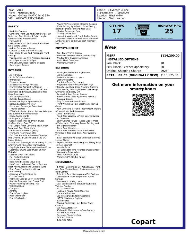 GoodThis is a 2014 MERCEDES-BENZ G 550 in black. The car has minor cosmetic imperfections such as minor dents and scratches. The wheels and lights appear to be in good condition, while the glass is clear. The vehicle is Run & Drive Verified, indicating it is in drivable condition. The interior shows minimal wear and tear.