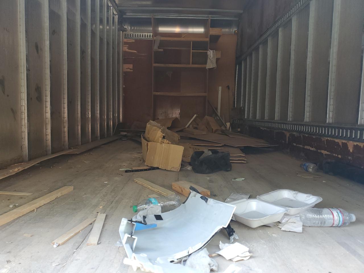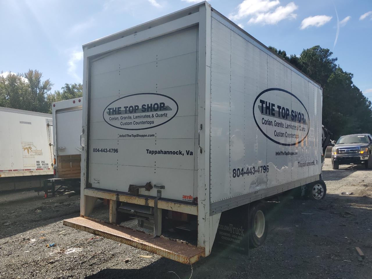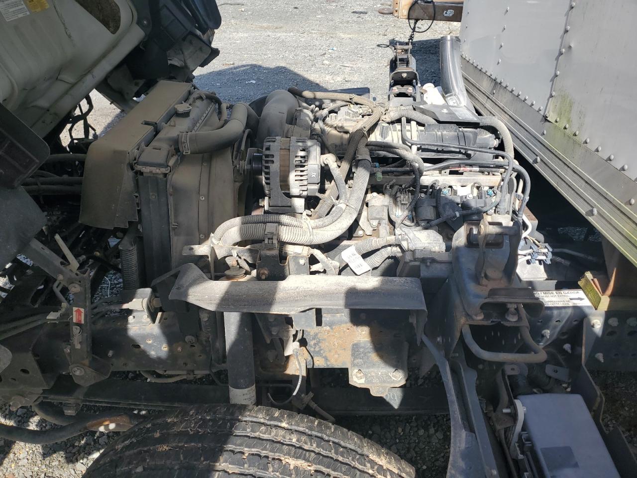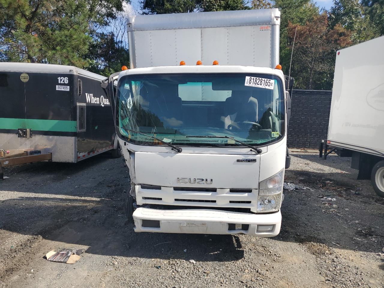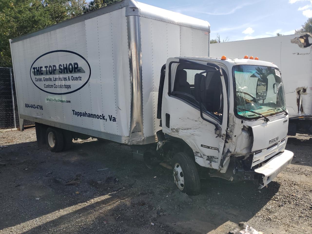 The ISUZU NPR has sustained significant damage. Primary damage is concentrated on the front end, with secondary damage affecting the undercarriage. There's noticeable damage to body panels, with the windshield being damaged.