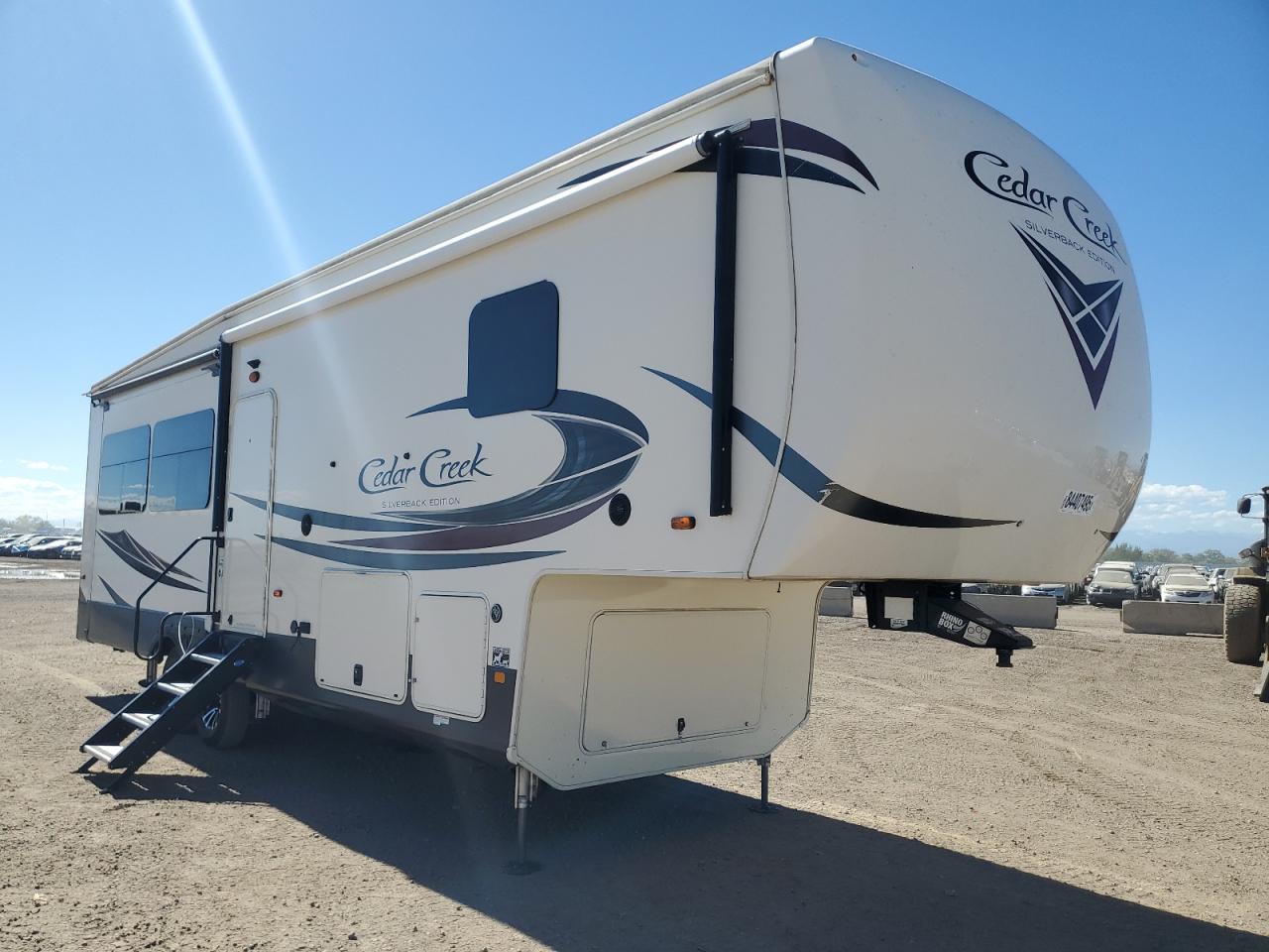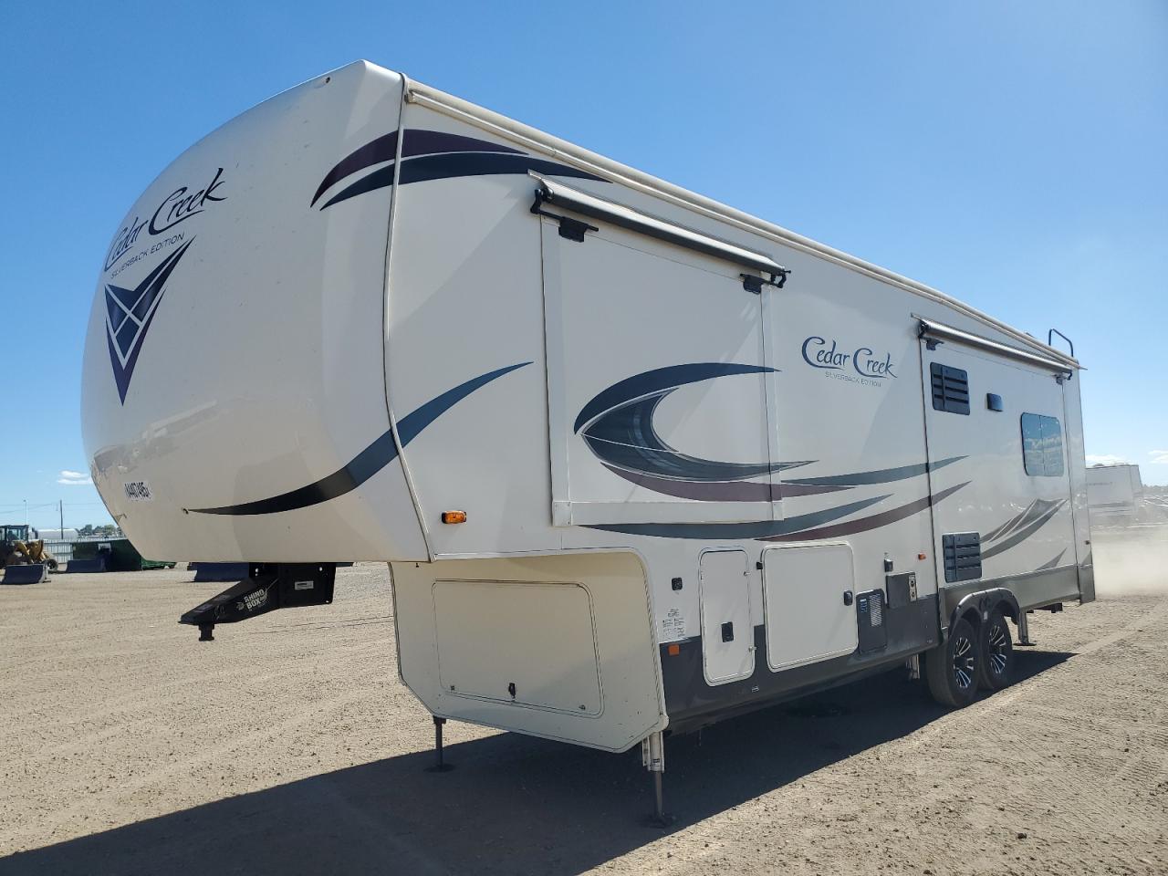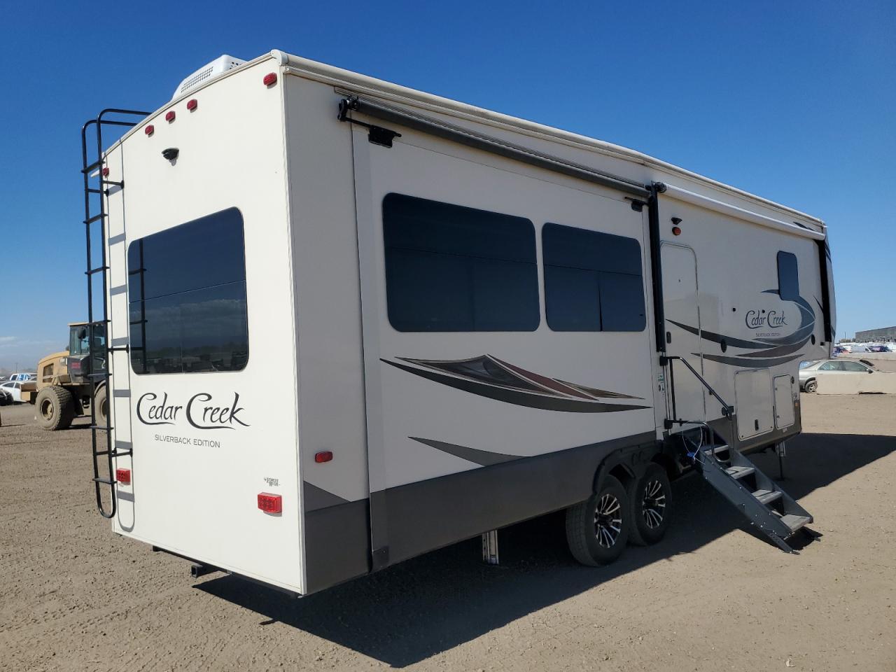 FairThis 2021 Cedar Creek RV, a cream-colored camper, presents with primary damage to the undercarriage and signs of burn damage. The exterior shows moderate damage, the wheels are present. The interior condition is good. The vehicle may require repair, but is drivable. Keywords: Cedar Creek, RV, camper, damage, undercarriage, burn, fair condition.