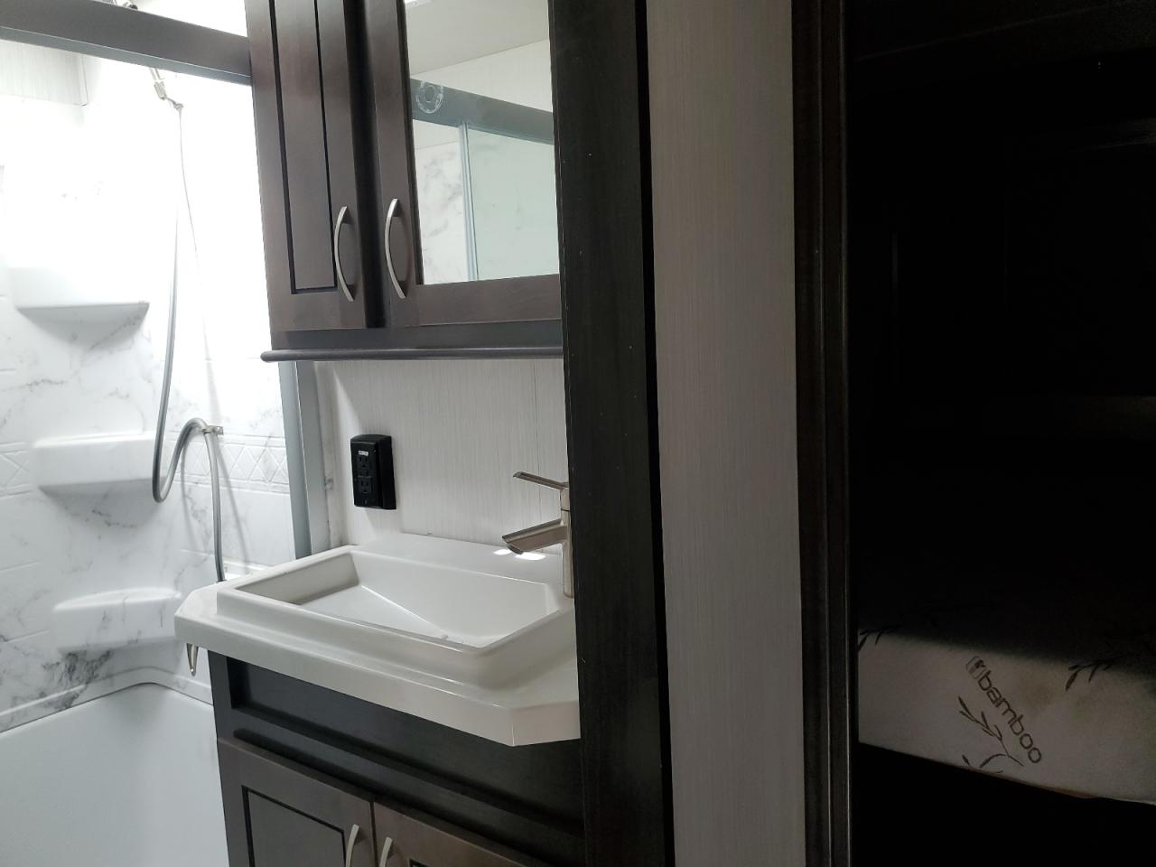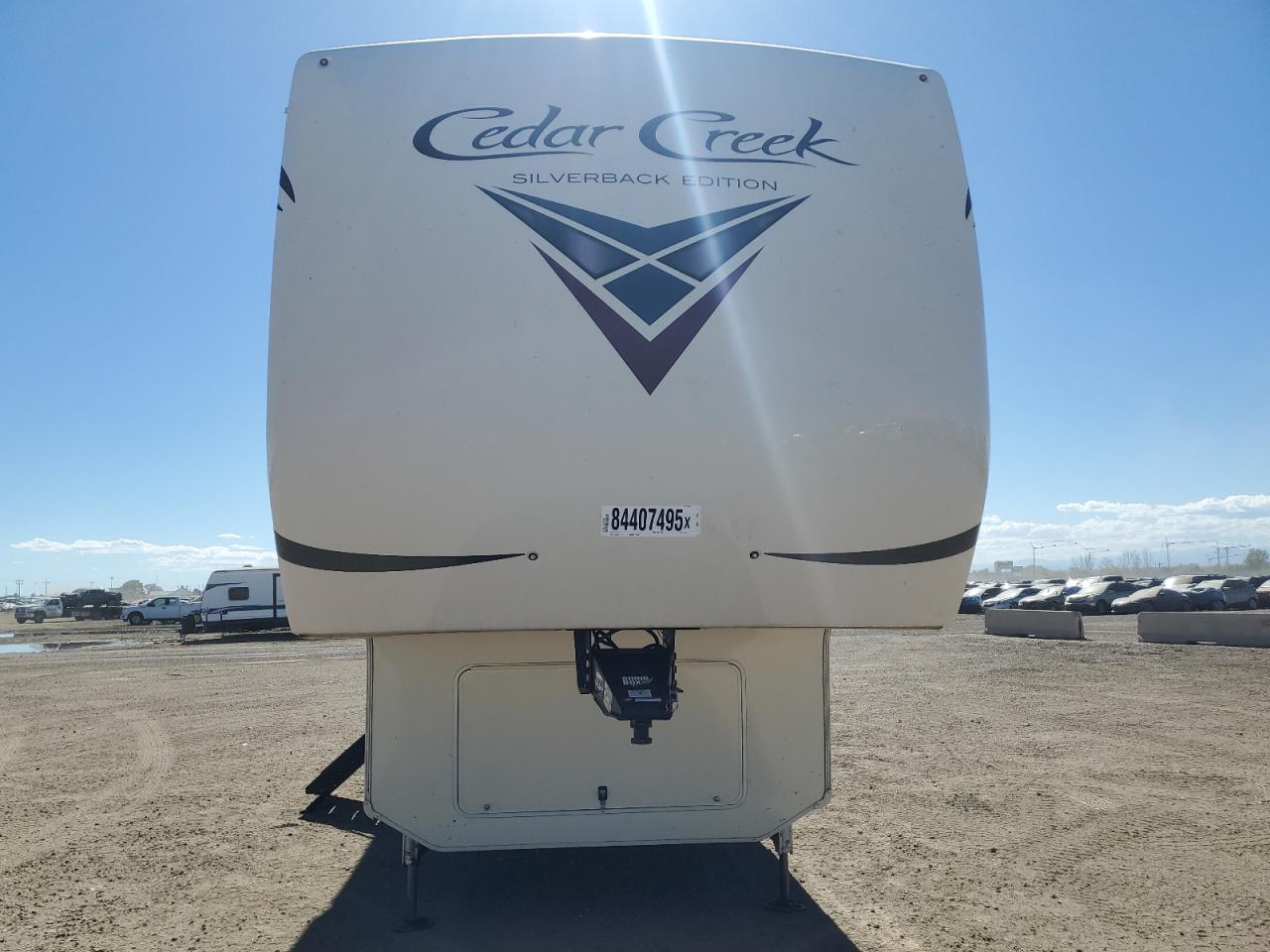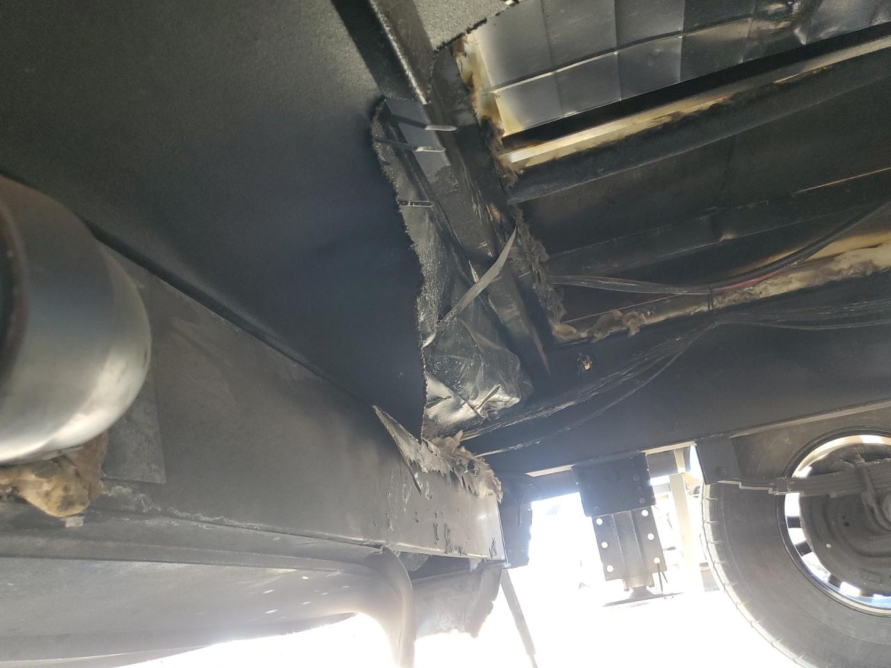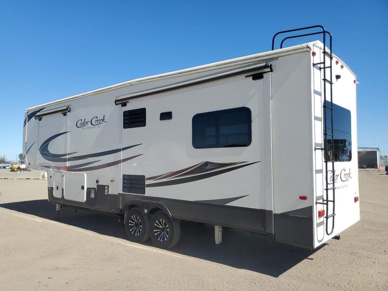 FairThis 2021 Cedar Creek RV, a cream-colored camper, presents with primary damage to the undercarriage and signs of burn damage. The exterior shows moderate damage, the wheels are present. The interior condition is good. The vehicle may require repair, but is drivable. Keywords: Cedar Creek, RV, camper, damage, undercarriage, burn, fair condition.